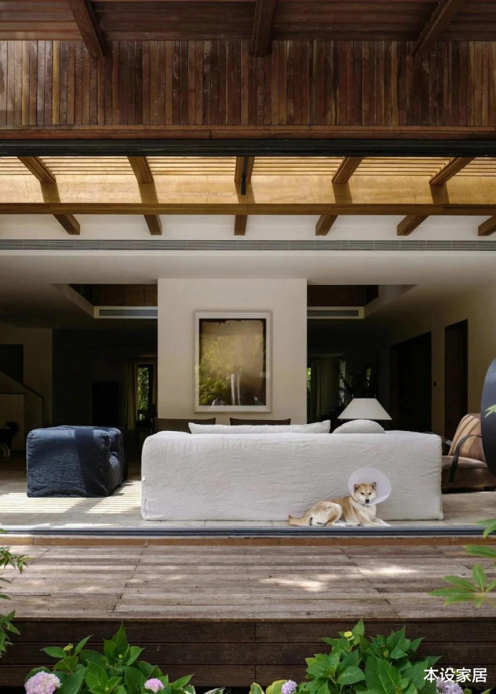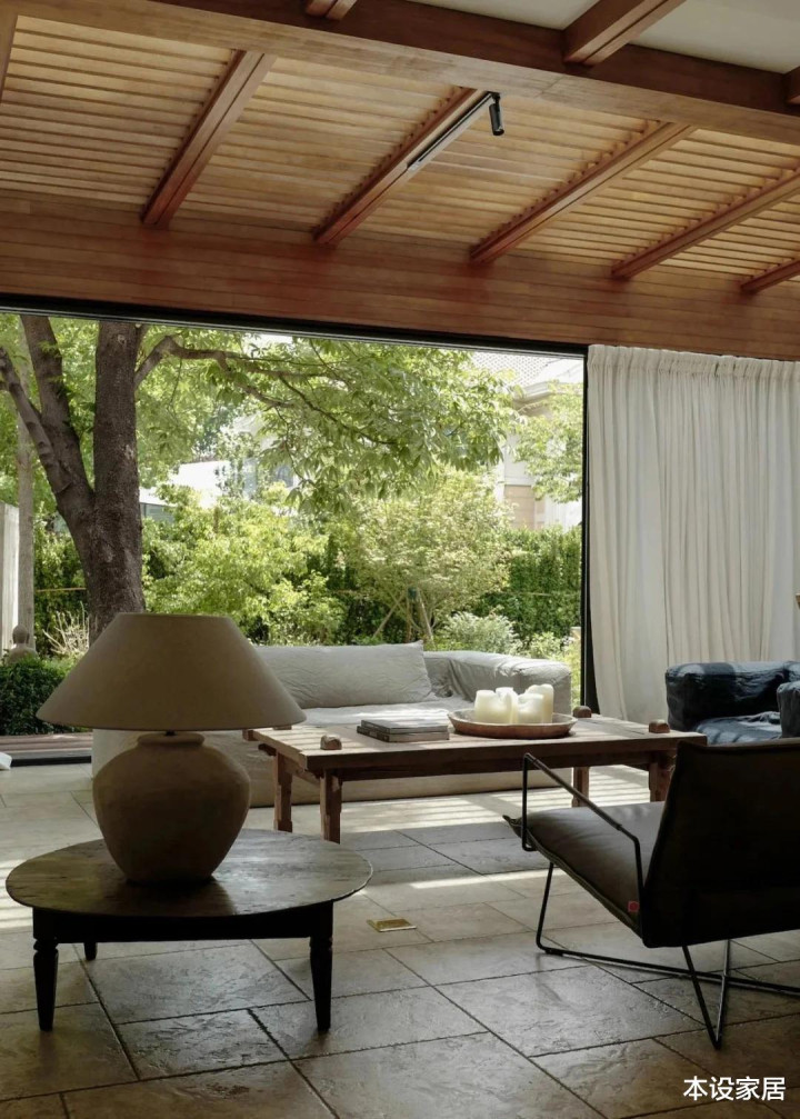 真正的客厅,布置在南面延伸位置,与中庭互相渗透,隔而不断,也将阳光、材质和松弛感体现得淋漓尽致。