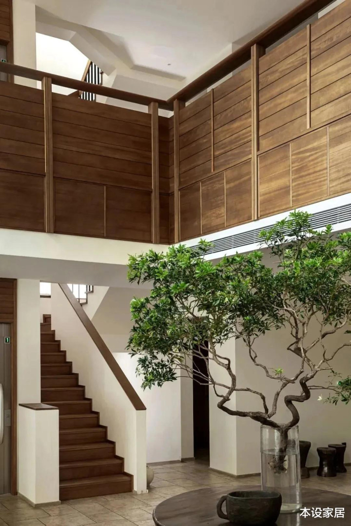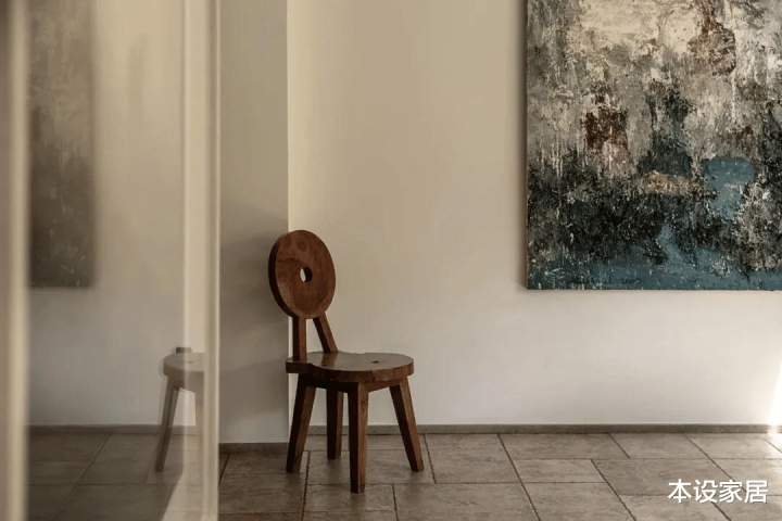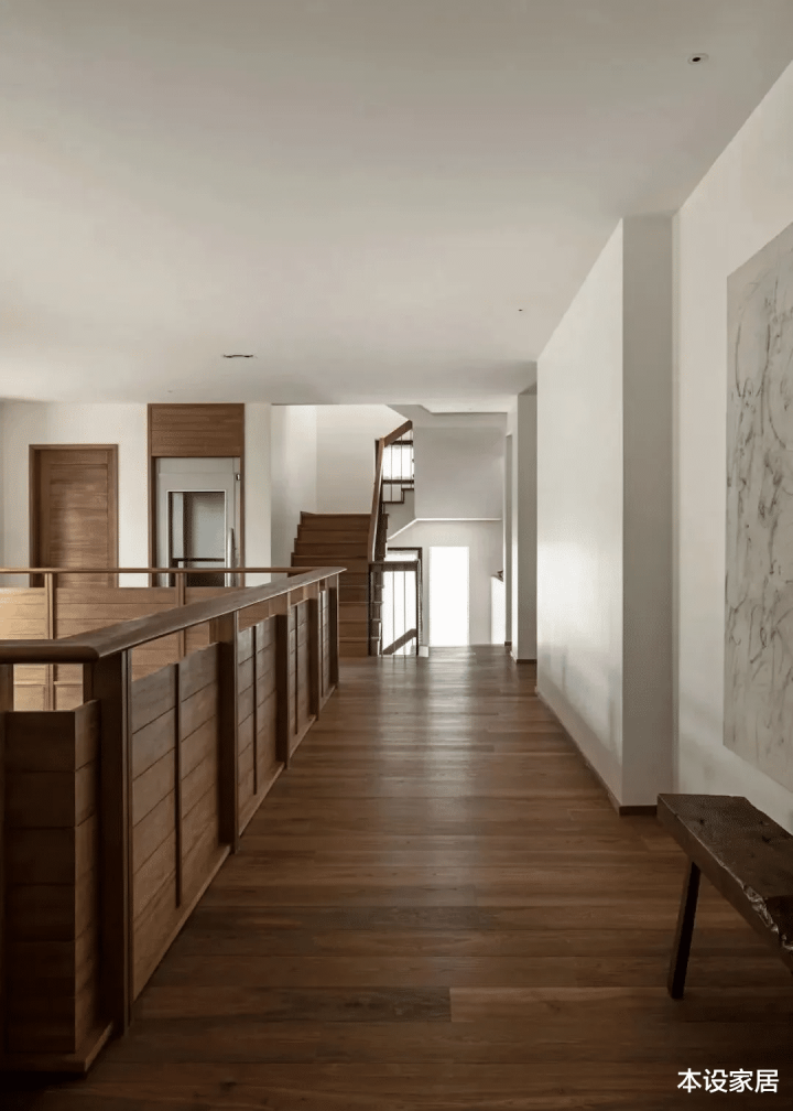 通往2楼和3楼的楼梯造型十分简洁,地面和扶手使用温润的实木,过道上偶尔摆放的老物件,以及墙面上来自名家的艺术品,就像美人迟暮脸上的皱纹,在历经岁月洗礼后,开出永不凋谢的花朵。