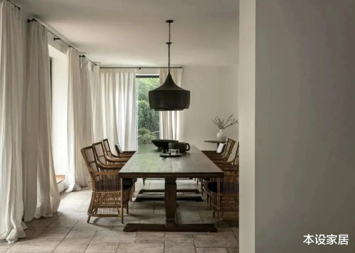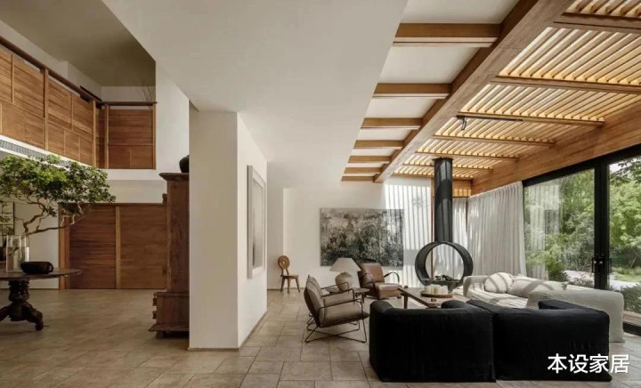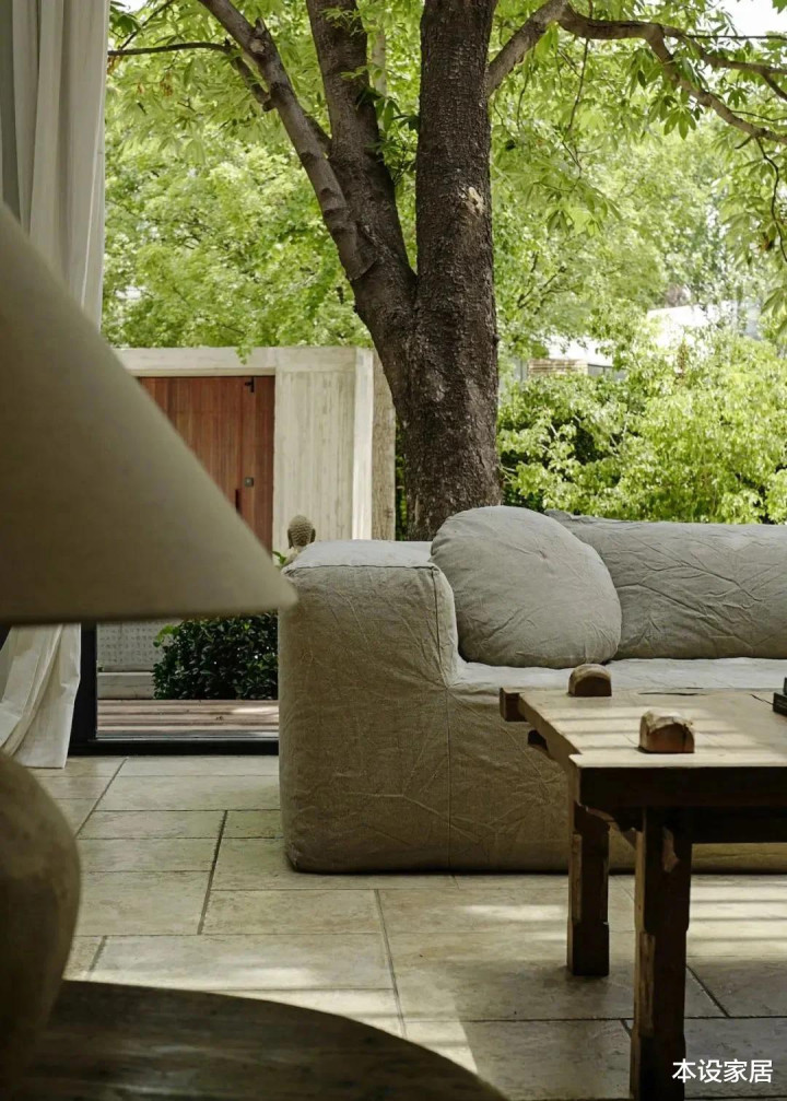 胡军的别墅位于北京,建筑外观是偏西班牙风格,而内装设计则出自国内侘寂风头牌谢柯老师,他善于利用老木头、手工陶砖、水洗石和棉麻织物等自然材质,搭配中古家具,并引景入室,营造出一个低调朴素,又不失质感的家居空间。