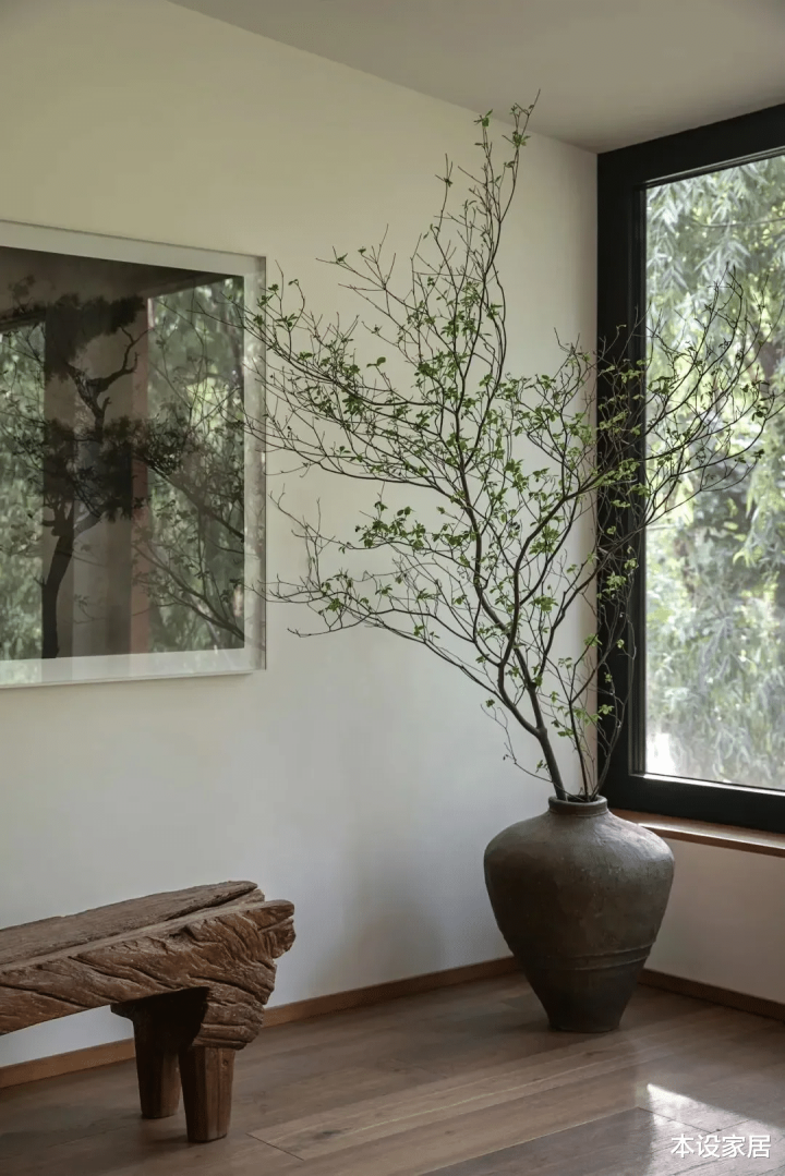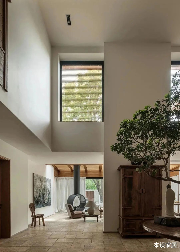 原本作为客餐厅的大空间,被改造成中庭,地面铺设大地色的方形手工陶砖,墙面大面积留白,局部温润的实木装饰,在马醉木的点缀下,显得静谧而美好。